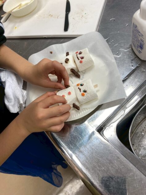 マシュマロスノーマンでは、ホワイトチョコをコーティングし、チョコペンやデコレーション材料でボタンや顔を描いたり、小枝をさして腕を表現したりと、子どもたちそれぞれが思い思いのスノーマンを作っていました。