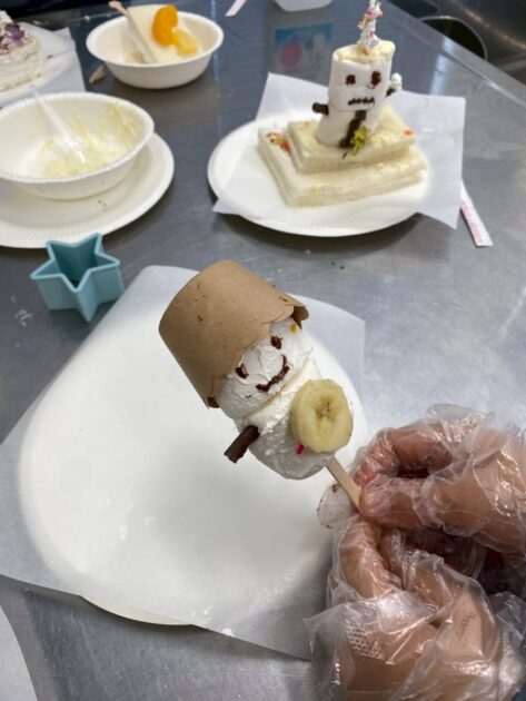 活動の後半ではクリスマススイーツ作りとして、マシュマロスノーマンとクリスマスツリーケーキを作りました。