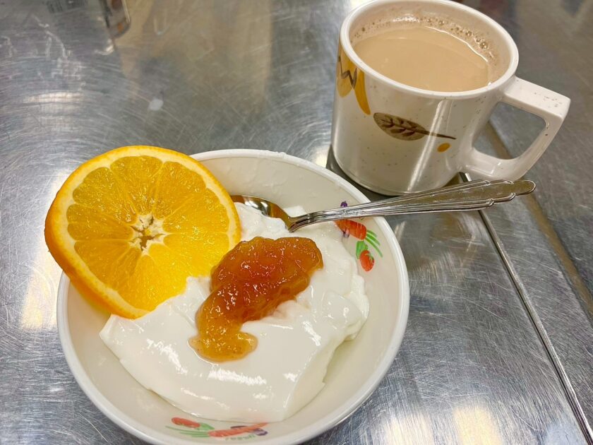 役割分担をしながら盛り付けを楽しみ、フードバンク様より提供いただいたオレンジも添えて、温かいお茶と一緒にいただきました。